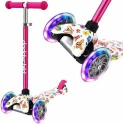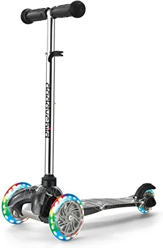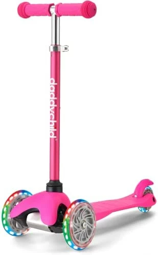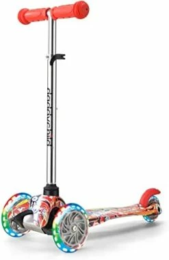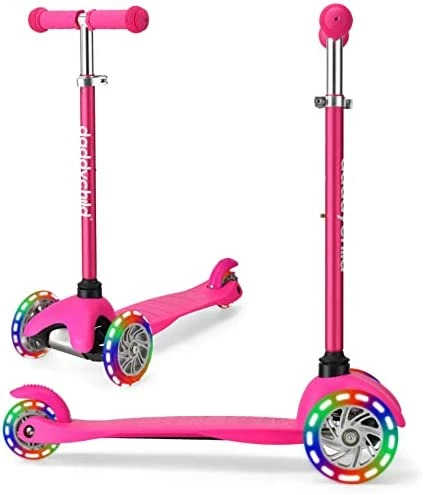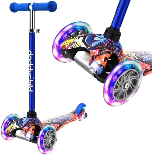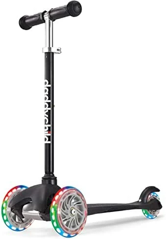 - AWESOME LED LIGHTS – DaddyChild printed scooters come with our unique, eye catching LED lighted wheels. Just simply start riding to activate. With 120mm PU flashing wheels, it’s wear-resistant and anti-slip contributes to smooth noiseless gliding. The wheels can adapt to various pavement such as the pebbles grass, concrete, wooden floor and on the carpet.