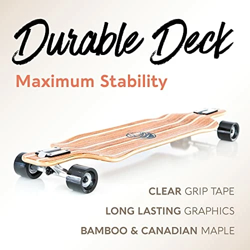 - Suitable for All-Skaters: Multi-layered Bamboo deck with Canadian Maple core is 38″ Long x 9.75″ Wide, provides a stable grip during skating. Ideal for Beginners, Intermediate or Advanced riders, who embrace the Skating lifestyle.