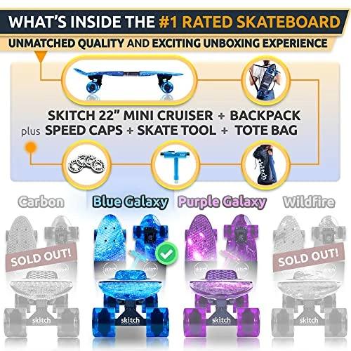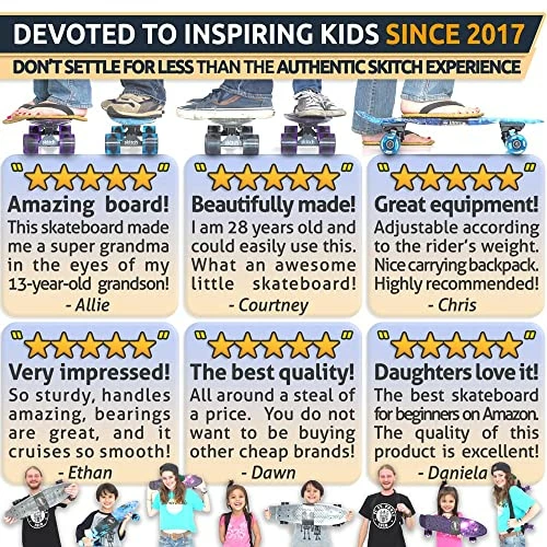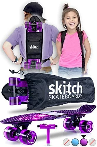 - β PERFECT FOR BEGINNERS – Fully adjustable for safe speeds for small children with an easier to carry, lightweight design with backpack is why parents choose Skitch as the best skateboard for beginner boys, girls and kids ages 6-12 years old