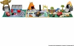 - Five additional pieces include a flag, cart, tire stack, fuel pump and audience stand that holds three mini cars (additional cars sold separately, subject to availability).