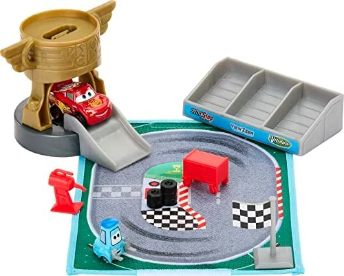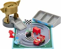- Take fun on the road with Disney Pixar’s Cars On-the-Go Mini Racers Piston Cup Race playset featuring the iconic location from the movies and Disney+ Cars On The Road series.
