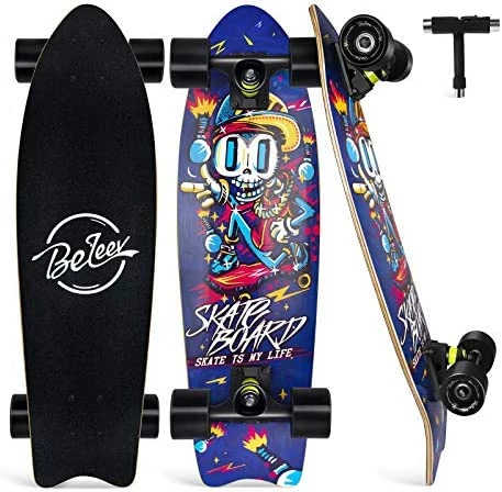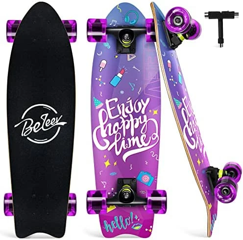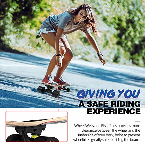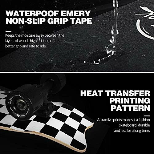 - Easy to Control: Double asymmetric kick tail concave design for easier braking and allows more energy from your heels to toes. The waterproof emery anti-slip grip tape provides a great traction in between your shoes and the board for a safe riding experience.