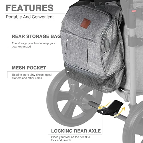 - γDESIGN FOR SAFETYγMade of premium 300D polyester fabric and high duty steel frame that can hold up to 110 lbs. A detachable canopy to provide shade for your kids. Featured a rear foot brake, 5-point safety belt ensures baby maximum safety , our folding wagons have the JPMA certified meet ASTM safety standard .
