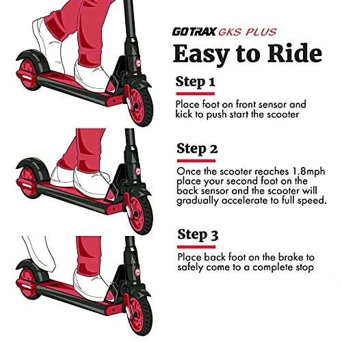 - Safe Electric Kick Scooter – Kids need to step on the front sensor button and kick to start, when the motor engages, kids can accelerate to 7.5 mph. The gravity sensor technology makes GKS PLUS safe and easy to control. The soft silicone hand grips and deck pad provide stability and comfort.