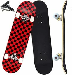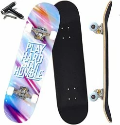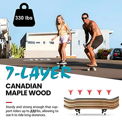 - Durable & StableοΌHigh density 7 layer Canadian maple wood matching with high-strength aluminum alloy trucksto add strength and stiffness , which are wear-resistant, waterproof and durable. it offers more traction for your feet and gives better control when skating. The max load is up to 330 lbs .
